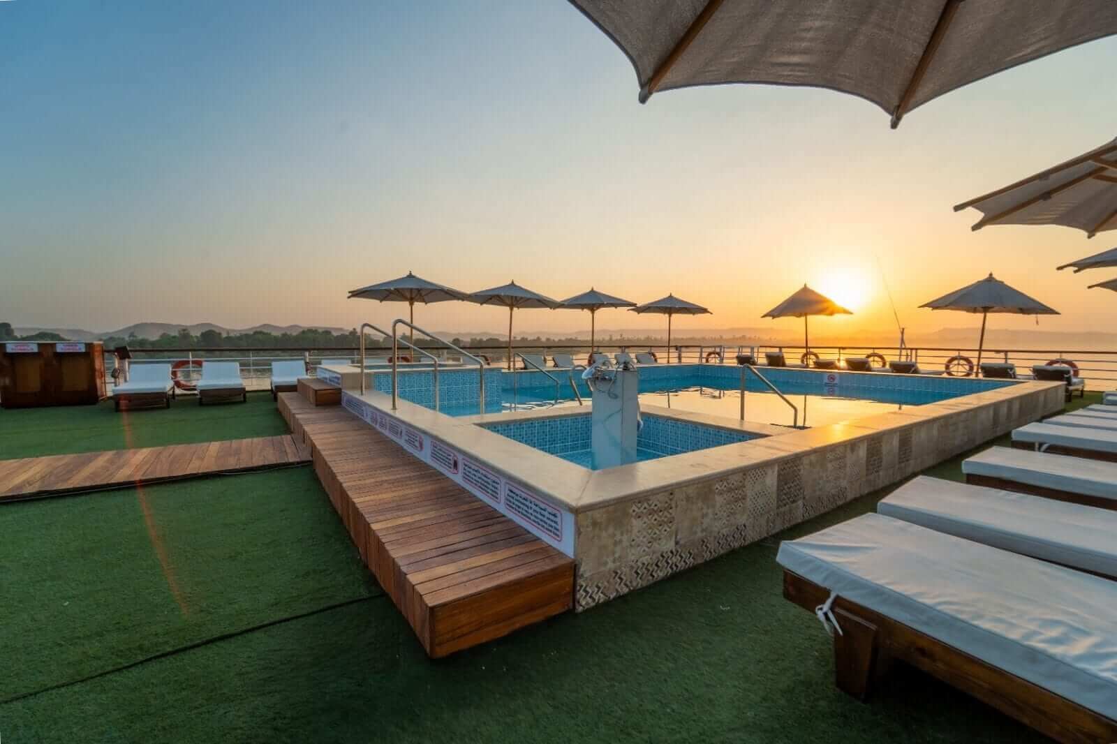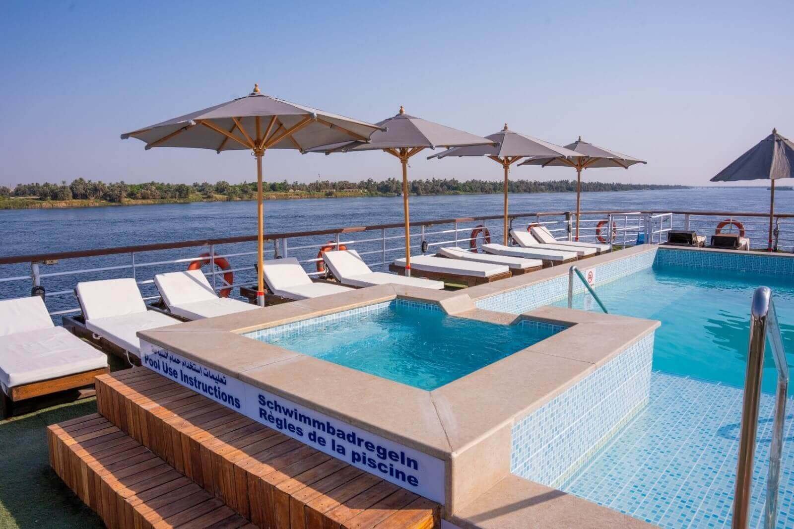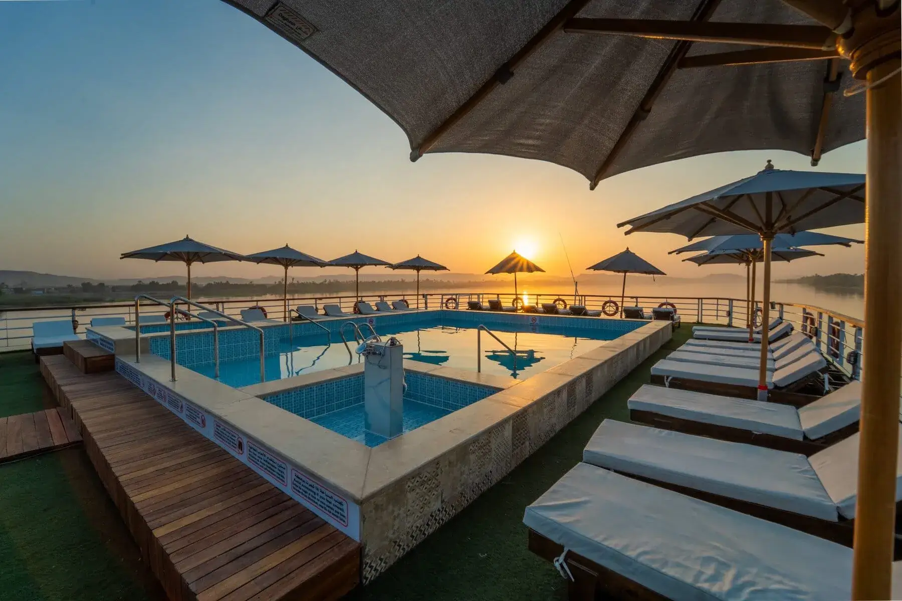 A luxury panoramic platform with a pool, jacuzzi, and unobstructed 360° views of the sky. Watch totality with astronomical experts by your side, or walk to Luxor Temple, just steps away from where we dock.
